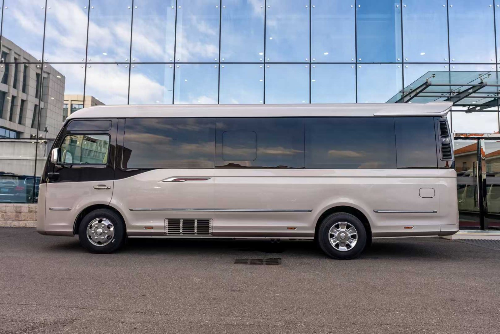 车身尺寸方面,红旗国悦的长宽高别离为7295/2090/2785mm,轴距达到了3990mm。侧面则采用了常见的中巴客车车身布局,厢式车身取单幅电动门相连系,同时还配备了副驾驶门,可选拆双色车身,添加了车身的多样性。